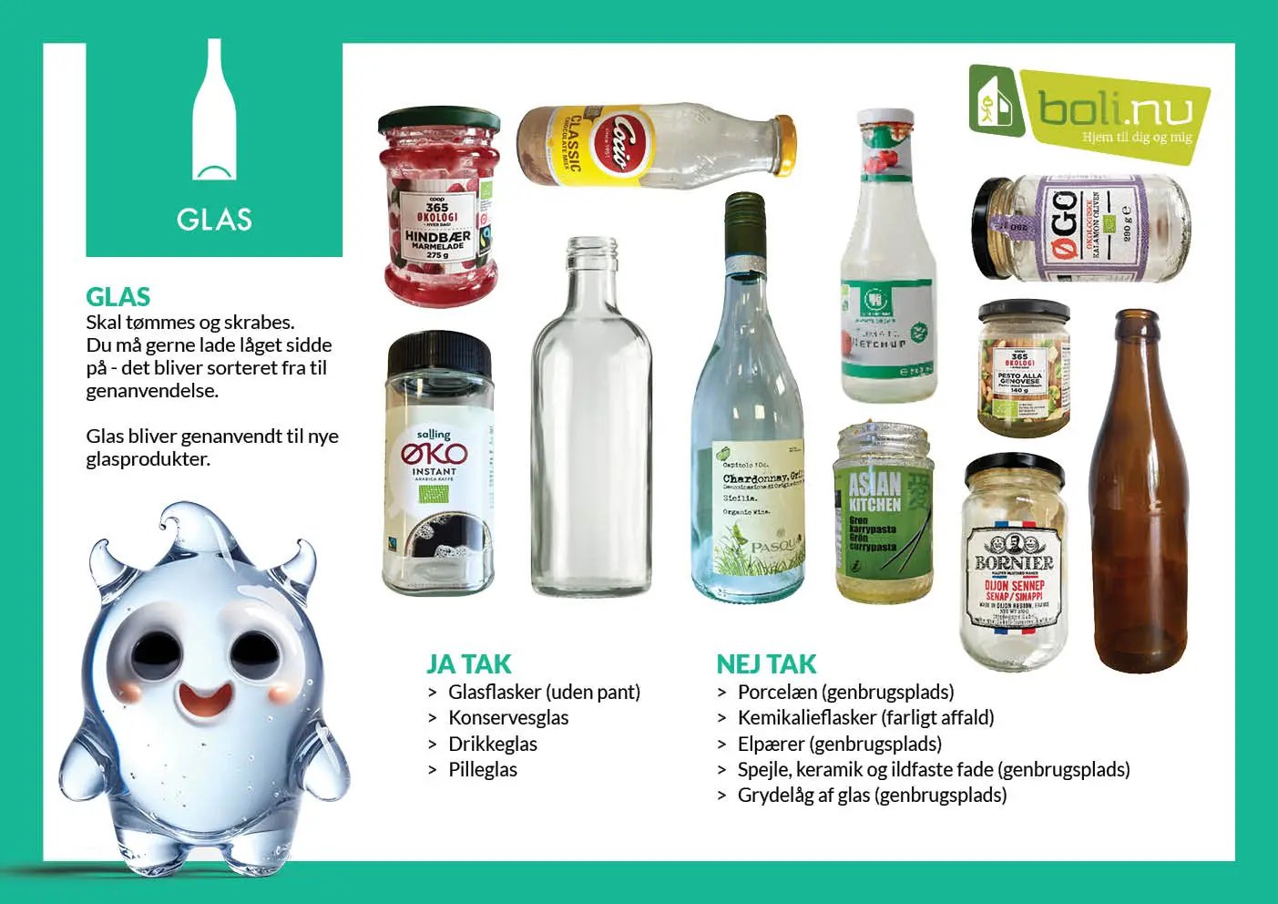 Skru altid låget af glas og vinflasker inden du afleverer begge dele i affaldscontaineren. Låg og emballage skal typisk i hver sin affaldscontainer.
