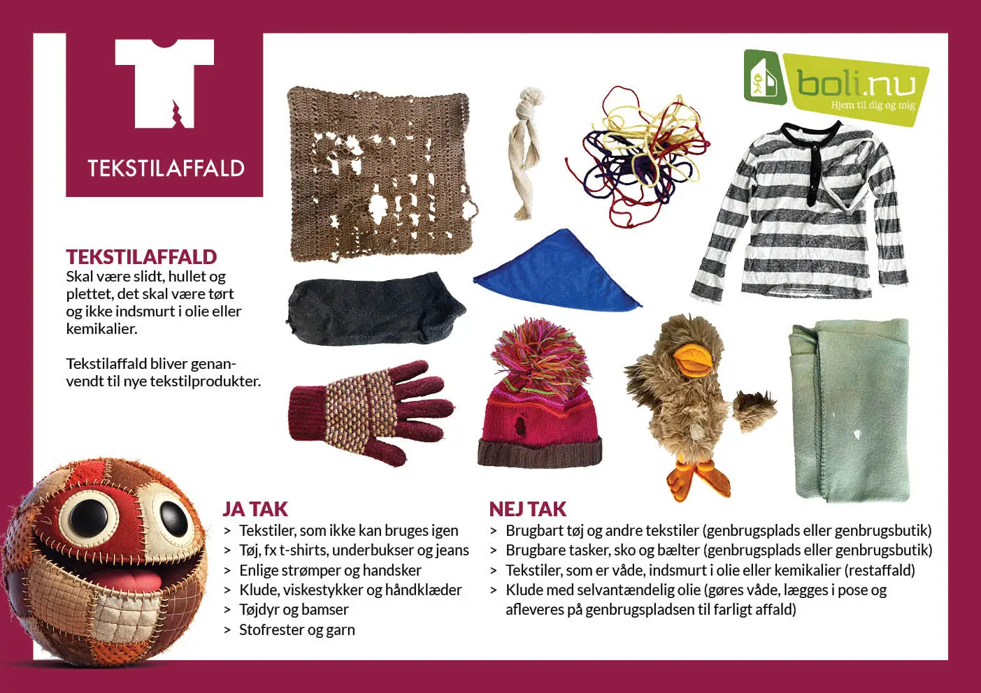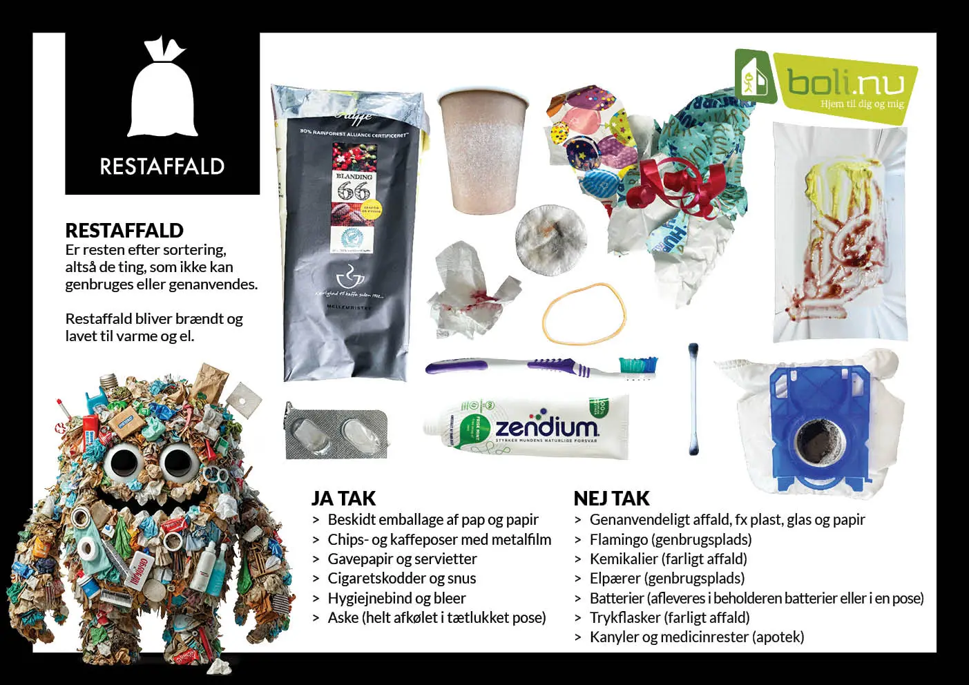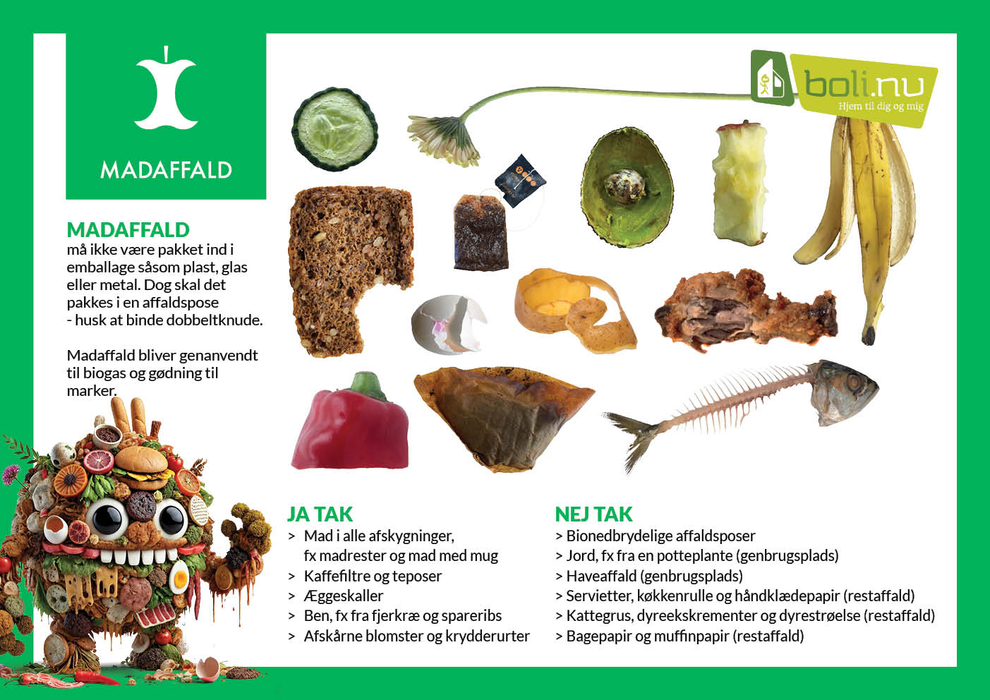 Madaffald, restaffald og tekstilaffald SKAL afleveres i plasticpose med knude. Glas, metal, plast, mad- og drikkekartoner MÅ afleveres i plasticpose uden knude. Pap og papir må IKKE afleveres i plasticpose.